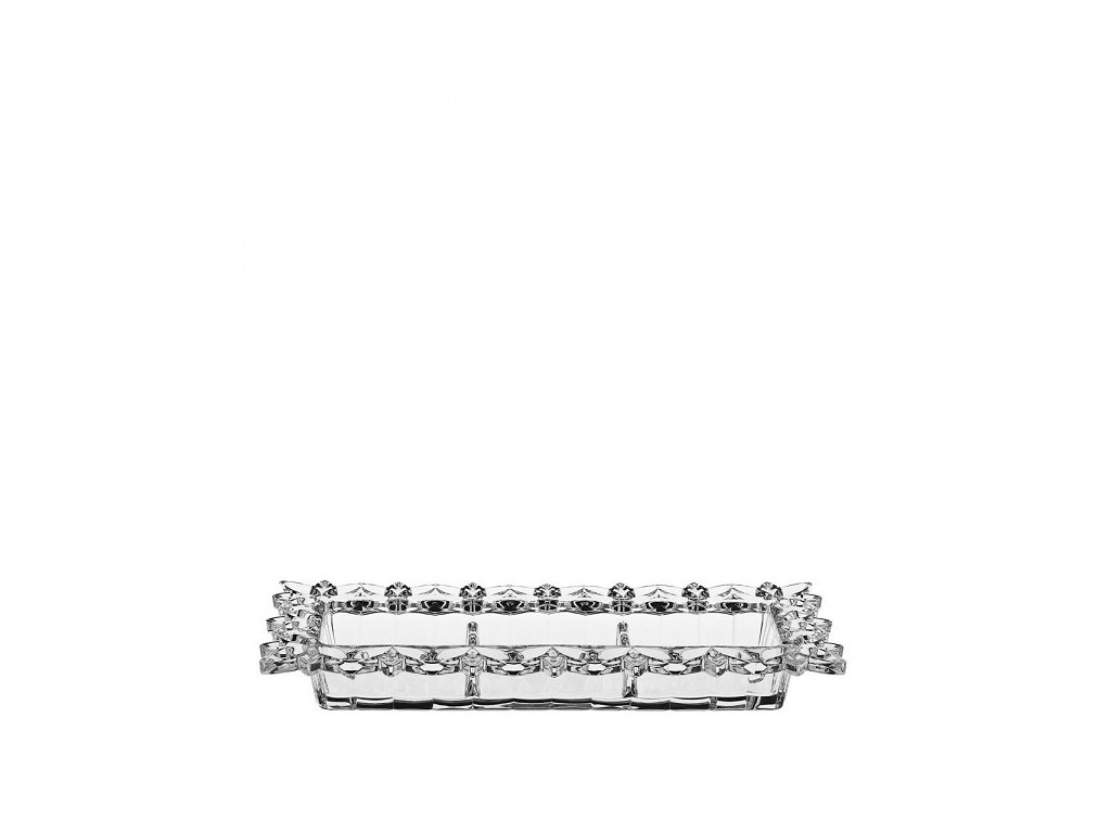 Servírovacia tácka na pochutiny z krištáľového skla . Na prestretom stole vynikne krása českého krištáľového skla v kombinácii s ozdobným lístočkovým lemovaním . Tácka tvorená tromi oddielmi vyrábajú poděbradské sklárne Crystal Bohemia s viac ako storočnou tradíciou výroby olovnatého krištáľového skla. Olovnatý krištáľ sa vyznačuje vysokou mierou pevnosti, transparentnosti a brilancie skla . Sklo je krásne lesklé a priehľadné. Pôvod výrobku je garantovaný ochrannou známkou Bohemia. Podnos je balený v tmavomodrej darčekovej krabici.