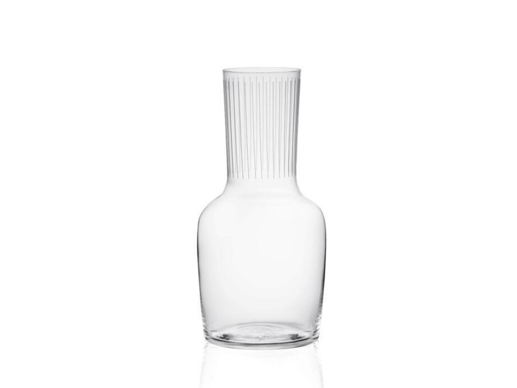 Charakteristickým prvkom je rytá dekorácia na hrdle , tvorená presne vyrezanými vertikálnymi líniami. Tie krásne zachytávajú svetlo, dodávajú sklu dynamiku a jemný optický pohyb a vytvárajú efekt, ktorý podčiarkuje jej minimalistický, avšak výrazný dizajn. Karafa sa tak stáva nielen funkčným kúskom, ale aj moderným doplnkom interiéru.