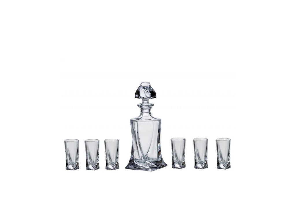Pálenku alebo likér si z Quadro setu zaručene vychutnáte. Je vyrobený z kvalitného olovnatého krištáľového skla známou českou sklárňou Crystal Bohemia zo Svetlej nad Sázavou. Pri podávaní vášho obľúbeného drinku vás na prvý pohľad zaujme tvarovanie karafy a pohárov , ktoré pôsobia súmerne a vyvážene. Výrobok má špičkové parametre porovnateľné s českým krištáľom. Set je dodávaný v elegantnej tmavomodrej darčekovej krabici a obsahuje karafu na likér alebo destiláty s objemom 500 ml a šesť pohárov s objemom 50 ml. Vhodný ako darček pre mužov na destiláty aj ženy na podávanie likérov.
