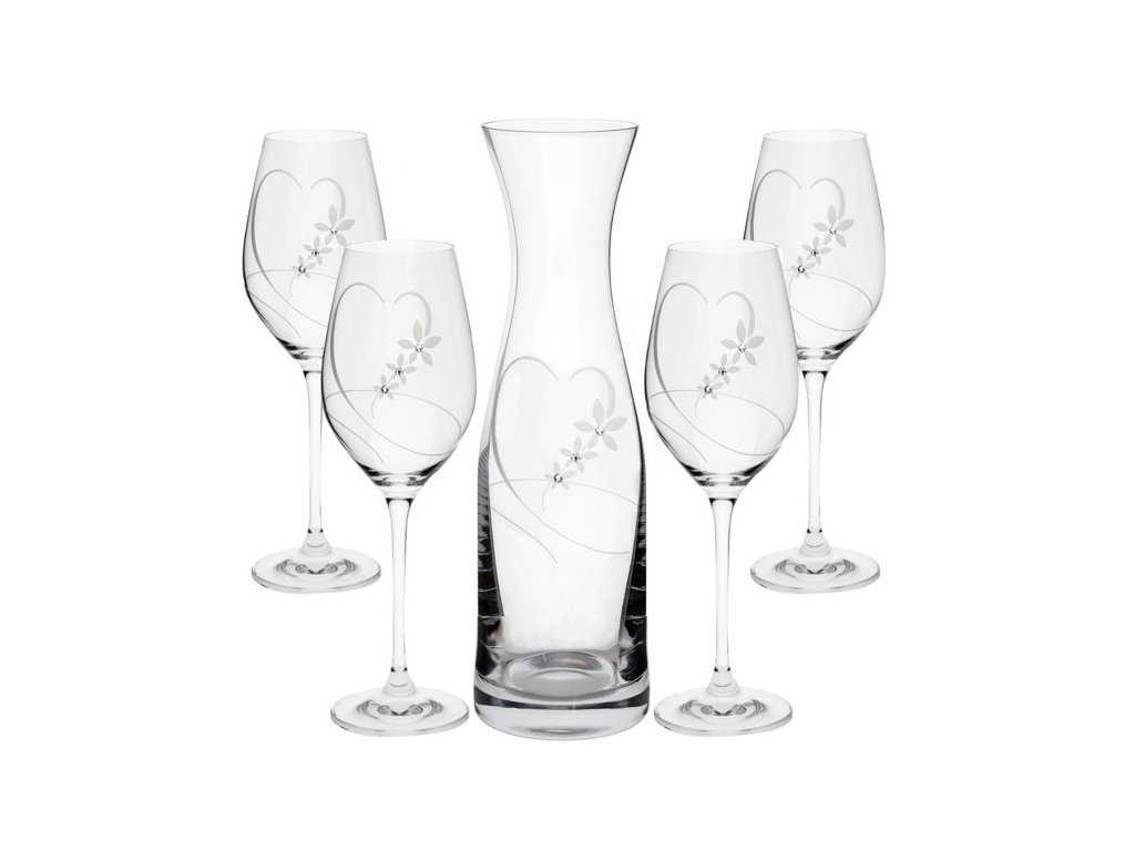 Nie je všetko zlato, čo sa trblieta. Svojím leskom a krásou vás ľahko oslnia aj kryštály z dielne českej výrobcu kryštálov Preciosa. A čo potom, keď sa dajú dohromady s ručne brúseným krištáľovým sklom! Takto vznikla luxusná sada na víno , ktorá vás očarí elegantnou úzkou karafou a štyrmi pohármi na vysokej nôžke. Každý kúsok sa pýši hladkým prevedením bez rušivých spojov a jemne zabrúseným okrajom , ktorý uľahčuje nalievanie vína a spríjemňuje jeho popíjanie. Steny pohárov i karafy zdobia brúsené srdce doplnené drobnými kvietkami a českými kryštálmi . Vďaka nežnej dekorácii prinesie set radosť vašej milej či milému, nech už sa vám na obdarovanie naskytne akákoľvek príležitosť. Rovnako dôstojne sa sada zhostí aj role daru pre novomanželov. Aby trblietavá ozdoba neutrpela žiadnu ujmu na kráse, odporúčame set umývať v ruke.