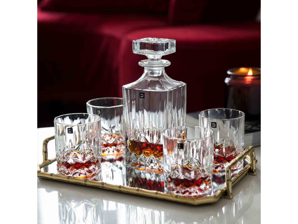 Vychutnajte si whisky so šarmom anglického gentlemana alebo s noblesou anglickej lady. Všetko, čo k tomu potrebujete, nájdete pod vekom dizajnovej krabice nesúcej logo slovenskej značky Diamante . Nitro obalu vystlané lesklým čiernym saténom v sebe ukrýva štyri whiskovky a hranatú karafu , z ktorých srší elegancia a luxus na míle ďaleko. Ich steny brázdi lisovaná dekorácia pripomínajúca šľahajúce plamene, ktorá podávanú whisky zaujímavo oživí a „rozpohybuje“. Fľaša dopĺňa masívna sklenená zátka s ozdobou symbolizujúcou slnko. Vďaka zbrúsenému hrdlu perfektne zapadne do fľaše a uzamkne v nej vôňu nápoja. Na výrobu tohto setu použili slovenskí „bratia“ okrem svojej zručnosti aj prémiový bezolovnatý krištáľ. Nezabudli ani na zabrúsenie okrajov pohárov, aby bol každý dúšok ešte o stupeň príjemnejší.