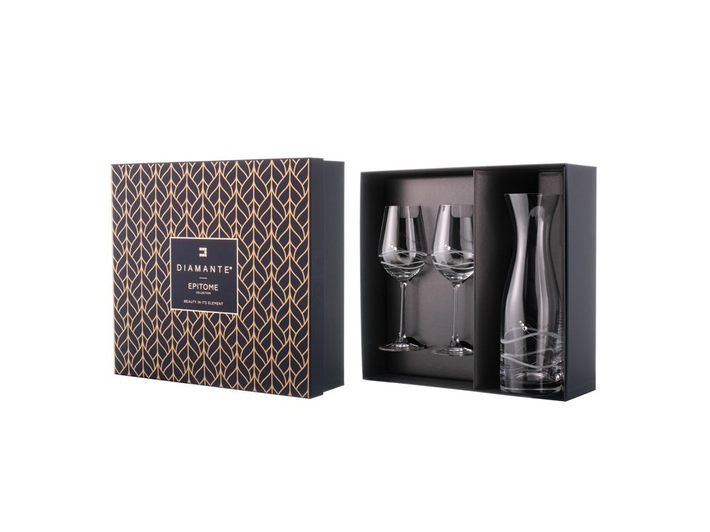 Chceli by ste milovníkovi alebo milovníčke vína zaobstarať darček, z ktorého nebude radosť len predstierať? Taký, ktorý skutočne využije a ktorý neskončí odložený na polici, kde bude len lapať prach? Kúpte vašej láske, narodeninovému oslávencovi alebo novomanželom set dvoch pohárov a karafy na víno s objemom 1 l. Sada je už zabalená v luxusnej darčekovej krabičke so zamatovým vnútrom, takže budete mať o starosť menej, pokiaľ ide o zabalenie darčeka. Steny pohárov i karafy zdobí matne brúsená zvlnená linka , ktorú elegantne dopĺňajú tri originálne kryštály Swarovski Elements. Poháre a karafa sú zhotovené z ručne brúseného a vysoko kvalitného bezolovnatého krištáľu. Vzhľadom na vzácnu dekoráciu odporúčame ručné umývanie.