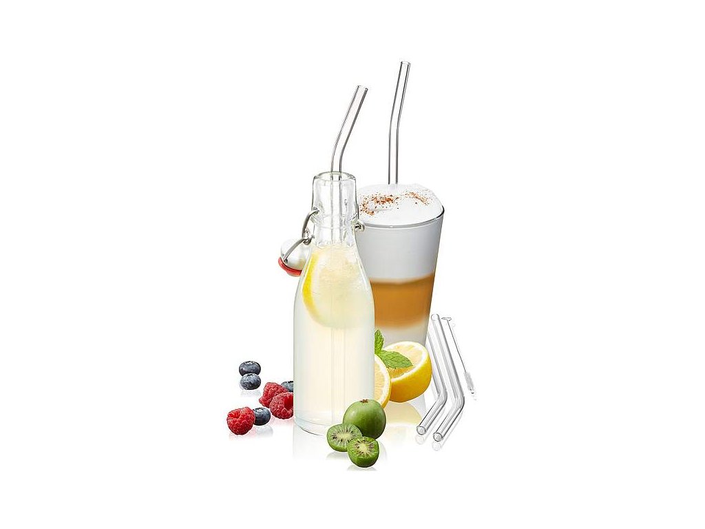 Jednorazovým plastovým slamkám už našťastie odzvonilo a ich miesta zaujali ekologickejší náhradníci. Títo sú vyrobení z číreho a veľmi pevného borosilikátového skla. Na rozdiel od ich plastových predchodcov alebo modernej papierovej alternatívy sa pri pití nedeformujú a je možné ich opakovane používať po mnoho rokov. Nijako tiež neovplyvňujú chuť podávaného nápoja. Po použití ich stačí umyť s pomocou oceľovej čistiacej kefky , ktorá je súčasťou sady, alebo si ušetriť prácu a prenechať ich očistu umývačke riadu. Sada obsahuje okrem kefky štyri slamky , ktoré sú dlhé 23 cm a na konci zahnuté . Vďaka tomu sa vám s nimi bude lepšie piť, napríklad priamo z fľaše. Slamky pochádzajú z produkcie nemeckej značky Gefu .
