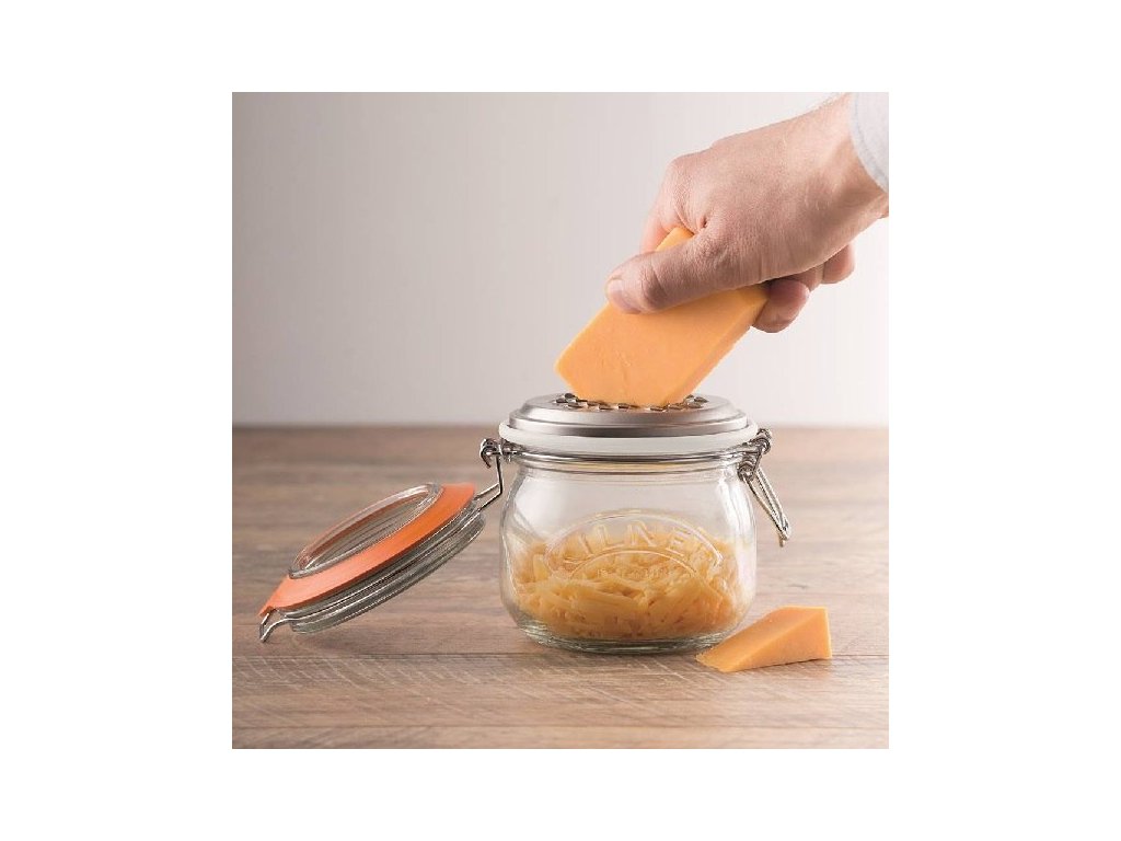 Vďaka tejto nápadito riešené sade nebolo strúhanie syra či čokolády nikdy jednoduchšie. Na pohár s klipovým uzáverom jednoducho umiestnite nástavec so strúhadlom a syr nastrúhate priamo do nádoby. Sada obsahuje pohár s objemom 0,5 ls ikonickým vrchným klipovým vekom, ktoré po uzavretí uchová potraviny skladované v chladničke dlho čerstvé. Nástavec so strúhadlom je možné umiestniť aj na ďalšie okrúhle Kilnerky o objemoch 1 l, 1,5 la 2 l. Sklenené časti sady je možné umývať v umývačke riadu.