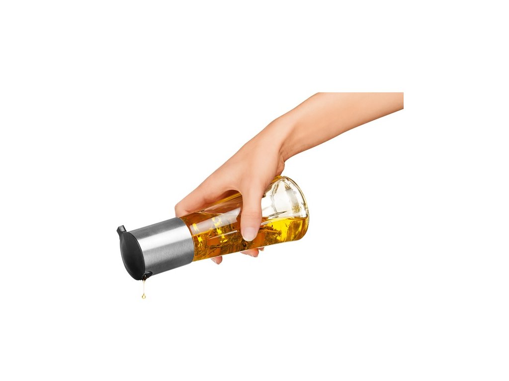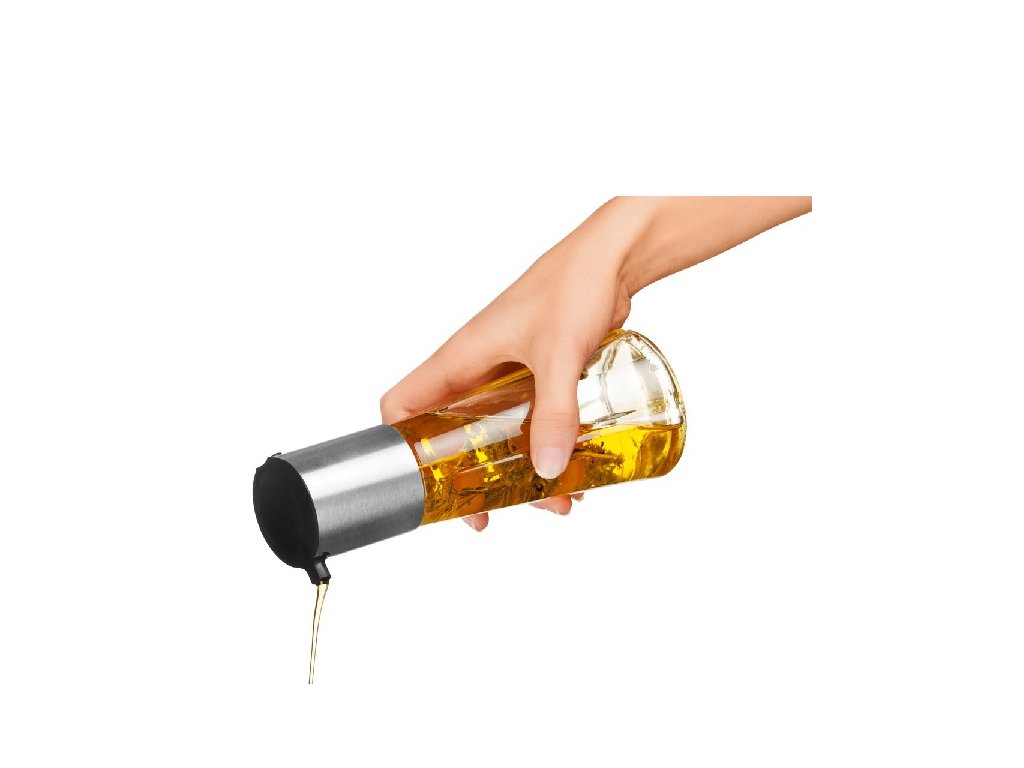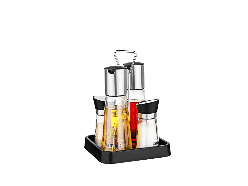 Moderná dochucovacia súprava na stojančeku si získa čestné miesto na vašom jedálnom stole. Je nielen praktická, ale zaujme aj svojim jedinečným dizajnom. Sada menážek sa skladá zo soľničky, koreničky a nádob na olej a ocot. Praktické nerezové madlo skvele poslúži pri premiestňovaní súpravy. Viečka z nehrdzavejúcej ocele a plastu vyzerajú elegantne a vďaka skrutkovaciemu závitu nádobky ľahko doplníte. Nádoby na ocot a olej sú opatrené dvoma otvormi rôznych veľkostí, dávkovanie tak môžete prispôsobiť vlastným potrebám. Takisto koreničky majú dva otvory, jeden s jemným Sypátko a druhý umožňujúci dávkovanie vo väčšom množstve. Koreničky sa uzatvárajú a otvárajú pootočením. Celá sada je vyrobená z odolného skla, ktoré je možné umývať aj v umývačke riadu.