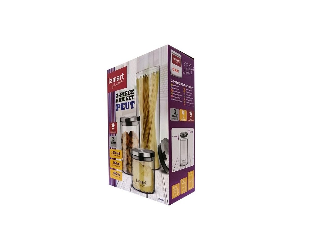 Elegantné a praktické riešenie pre každú kuchyňu. Sada troch dóz Lamart predstavuje štýlovú kombináciu pevného skla a viečok z nerezovej ocele a tvrdeného plastu . Každá dóza má svoje využitie – najväčšia sa hodí na špagety , stredná napríklad na cereálie alebo sušienky a najmenšie skvele poslúži na orechy, sušené ovocie či ryžu .