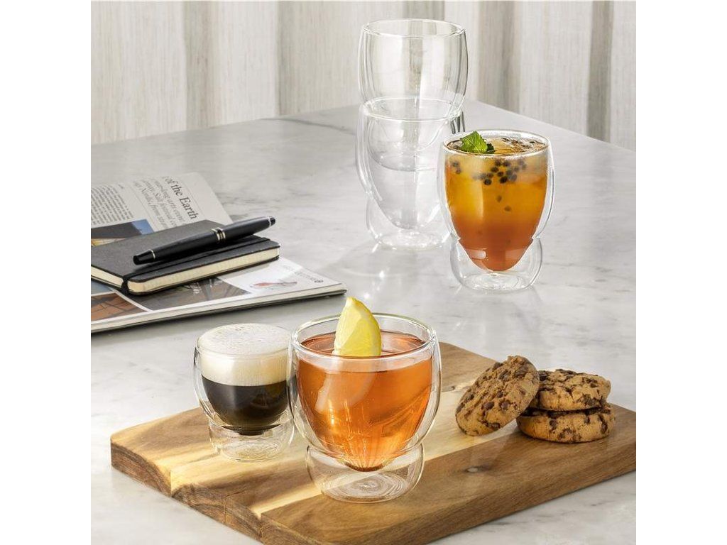 Špeciálna dvojstenná konštrukcia vytvára medzi stenami izolačnú vrstvu, ktorá pomáha udržať espresso dlhšie v ideálnej teplote . Súčasne zabraňuje prehrievaniu vonkajšieho povrchu pohára, takže ho môžete pohodlne držať v ruke hneď po naliatí kávy.