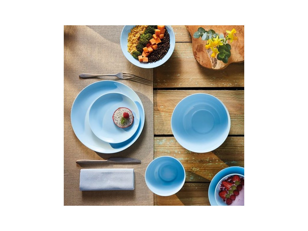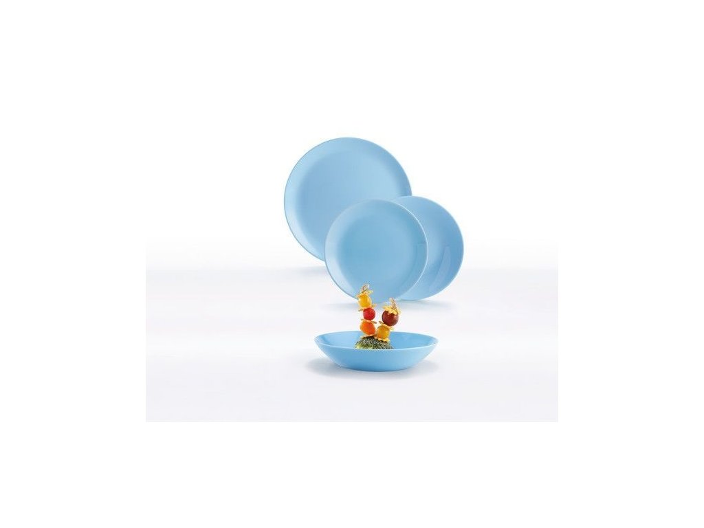 Farbu letnej oblohy bez mráčika má jedálenská súprava Diwali Light Blue presláveného francúzskeho výrobcu Luminarc. Taniere sú vyrobené z tvrdeného opálového skla a vďaka tomu lepšie odolávajú nárazom. Vhodné sú pre použitie v mikrovlnnej rúre i umývačke riadu. Jedálenská súprava je úplne hladká, bez dekoru a potlače. Svojou blankytnú farbou evokuje súprava pocity pri letnej, slnečné pohode. Súprava obsahuje 6x plytký tanier o priemere 25 cm, 6x dezertný tanier o priemere 20 cm a 6x hlboký tanier o priemere 19 cm.