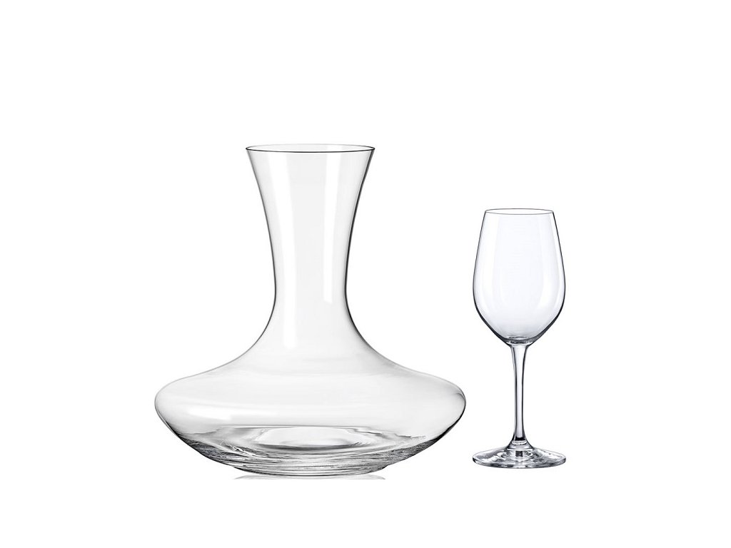Karafa a poháre na víno elegantných línií od slovenských sklární Rona. Sada je vyrobená z bezolovnatého krištáľového skla, ktoré zaručuje vysokú trvanlivosť a odolnosť. Sklo zostáva krásne číre aj po 1000 umývacích cykloch v umývačke. Poháre majú jemne brúsený ústnej okraj a krásny zvuk. Pri výrobe pohárov bola použitá najmodernejšia technológia ťahané nôžky. Zaisťuje hladký, plynulý prechod bez spoja medzi nôžkou a kalichom a zvyšuje tak odolnosť pohárov. Karafa potom dokonale pripraví víno pre vaše chuťové bunky.