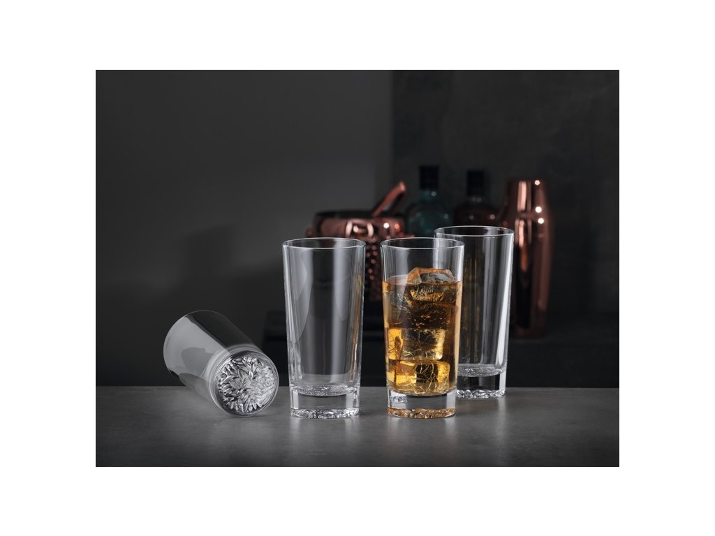 Na prvý zbežný pohľad vyzerajú ako klasické vysoké poháre na long drinky a nealkoholické nápoje, ktoré vďaka zosilnenému dnu pôsobia elegantne a luxusne – nehovoriac o ich výbornej stabilite . Stačí sa však nad ne nakloniť a oslní vás nápadito zdobené dno , ktoré ako by bolo posiate desiatkami drobných lístkov. „ Farebná náplň“ v podobe kokteilu, džúsu alebo malinovky vytvára obzvlášť pôsobivý optický efekt „levitujúceho nápoja“. Súprava štyroch longoviek z kolekcie Lounge 2.0 vznikla v dielni nemeckého výrobcu Spiegelau. Na ich zhotovenie bolo použité bezolovnaté krištáľové sklo, ktoré je výnimočné svojou priezračnosťou a nadštandardnou odolnosťou proti rozbitiu. Poháre sa nemusíte báť umývať ani v umývačke riadu.