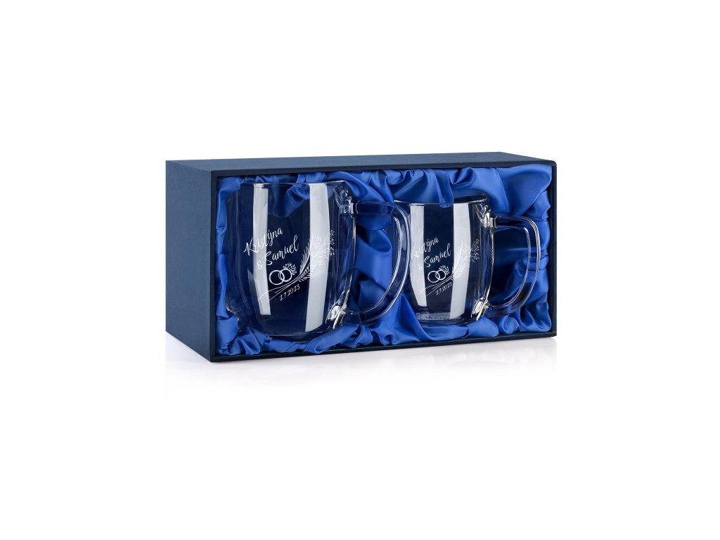 Pieskujeme na pivný polliter a tretinku VIENNA nemeckých sklární Sahm. Polliter aj tretinka sú z pevného lisovaného skla odolného proti rozbitiu. Set je dodávaný v modrej darčekovej krabičke, vo vnútri potiahnutej modrým saténom .